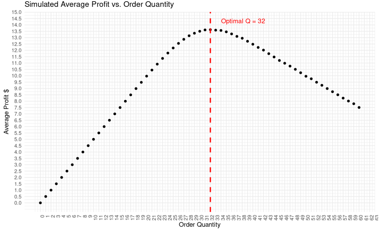 Simulation allows us to see that range of outcomes and confirm that the production quantity suggested by the newsvendor model, is truly optimal financially. This happens by simulating a large number of days’ demand, seeing how the financials shake out on each day, and aggregating the results.